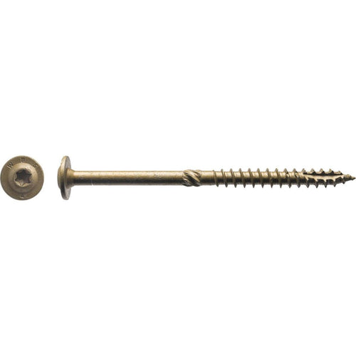 Structure screw features: round washer head, knurled shoulder, deep sharp threads, and hardened steel construction. ICC certified and ACQ compatible for most exterior uses.