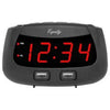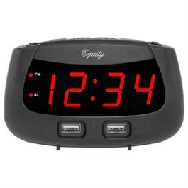 Equity, 0.9", black case with red digits led dual usb alarm clock, 1a & 2a, 9 minute snooze & beep alarm, ac powered with battery backup, "9v" battery not included.
