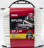 Twisted Nylon Rope. 278 lbs (126 kg) Safe Work Load (SWL). Great general purpose rope. Best material for hauling, lifting and towing. Excellent abrasion resistance and handling characteristics. Holds knots securely and can handle dynamic loads. Premium choice over all other synthetic ropes. Melt and tape the ends to prevent unraveling. Size 3/8” x 50’. White.